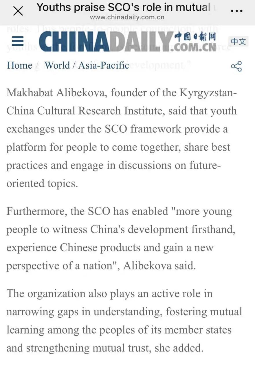 今天是七夕节,我们收到了一份特别的“礼物”—— 2025年8月29日的《中国日报》 客观报道了中吉文化研究院创始人 马哈巴特·阿利别科娃(汉娜) 关于上合组织青年交流的采访。
